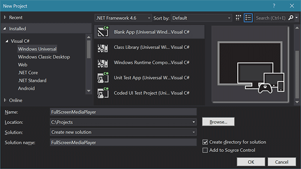 Öncelikle Visual Studio 2017 editörümüzü açalım ve hemen yeni bir Blank App (Universal Windows) projesi oluşturalım;
